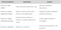 July 10, 2025 - Typically, we can provide Method references in three ways, sometimes called the types of it. ... Now, let’s try to observe them one by one from below table. ... We will cover them separately in the subsequent sections. Furthermore, in this section we will see the example of each type one by one.