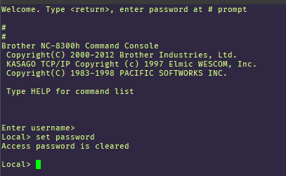 Note: when you change the password from telnet it will change both web and telnet passwords. (in my Brother MFC model) You can clear the password if you leave the password as a blank. Also, it will automatically revert the telnet password back to