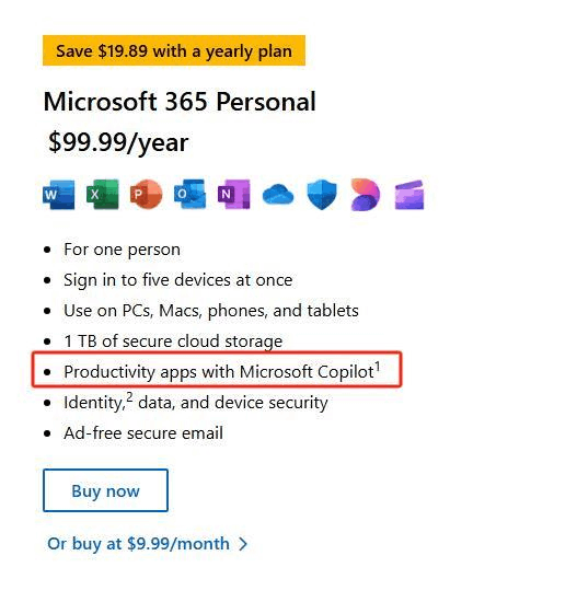 - Microsoft 365 Personal: $99.99/year or $9.99/month.