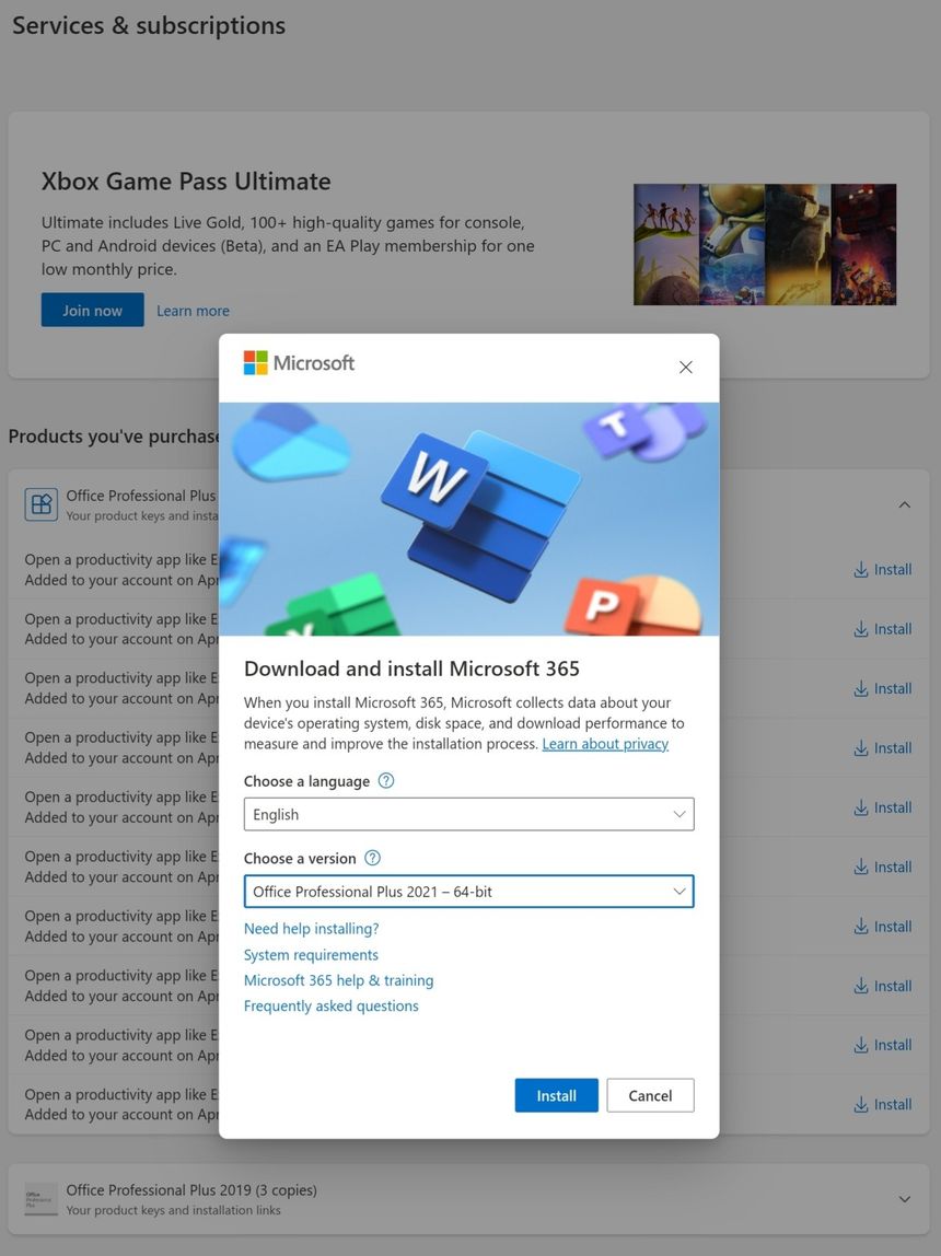To install the 64-bit version, please go to the Services and subscriptions page and on that page find the Office product you want to install and selectInstall.