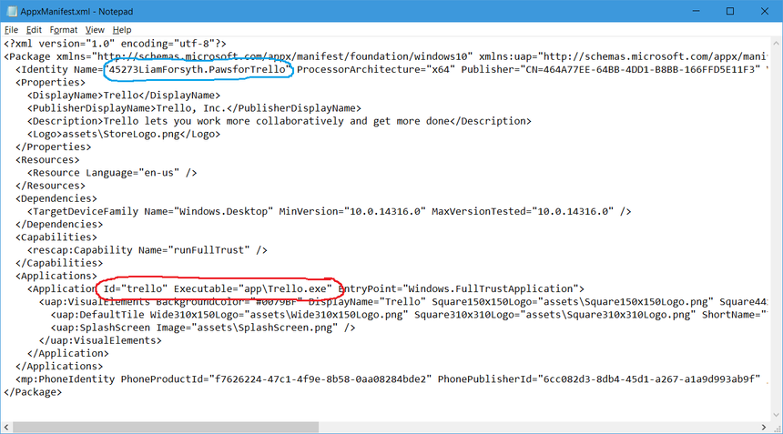 AppManifest.xmlfile, and open it in Notepad - You're now looking for two things - the package identity (circled in blue) and the application identity (in red, next to