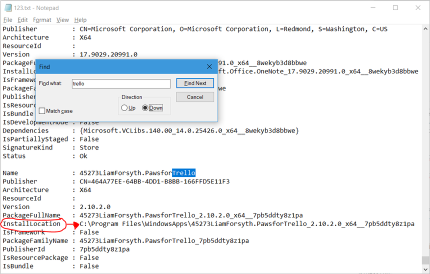Get-AppxPackage >apps.txt - Open the file in Notepad (or another text editor), and use the Find function to search for the app you're looking for