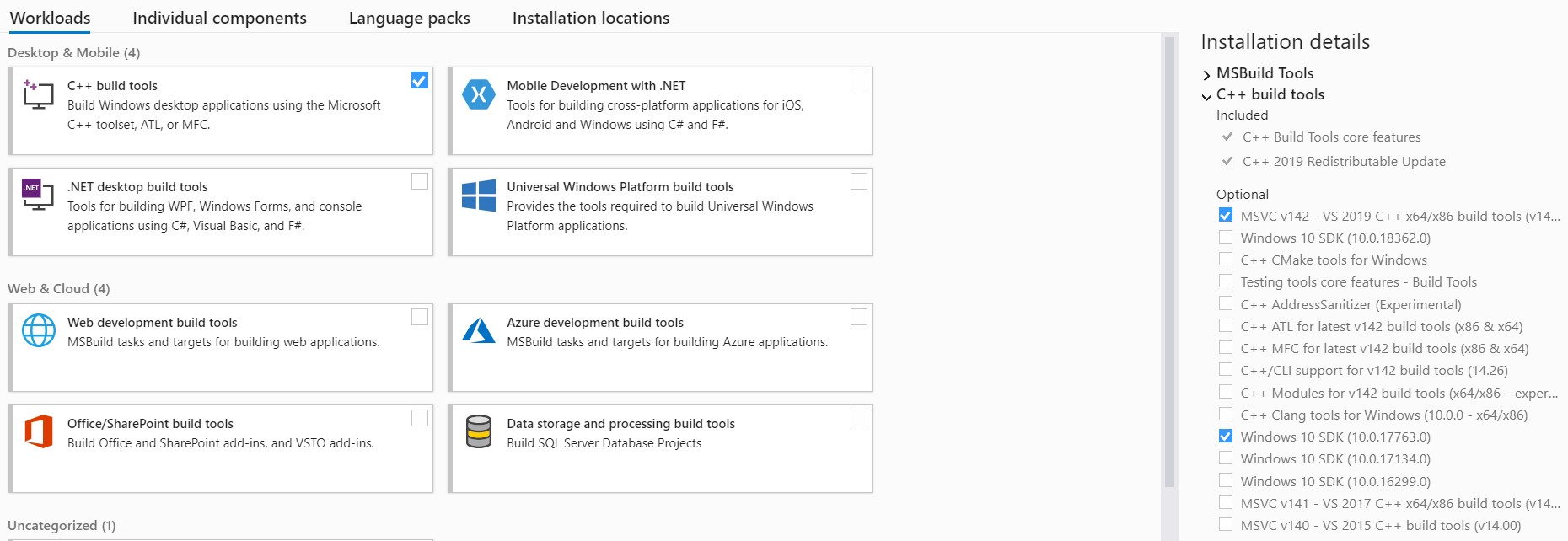- Run and under Workload select C++ Build Tools, then under Options select MSVC v142 - VS 2019 C++ x64/x86 build tools (v 14.26) & Windows 10 SDK (10.0.17763.0) only (selects newer versions if available, +1GB download)