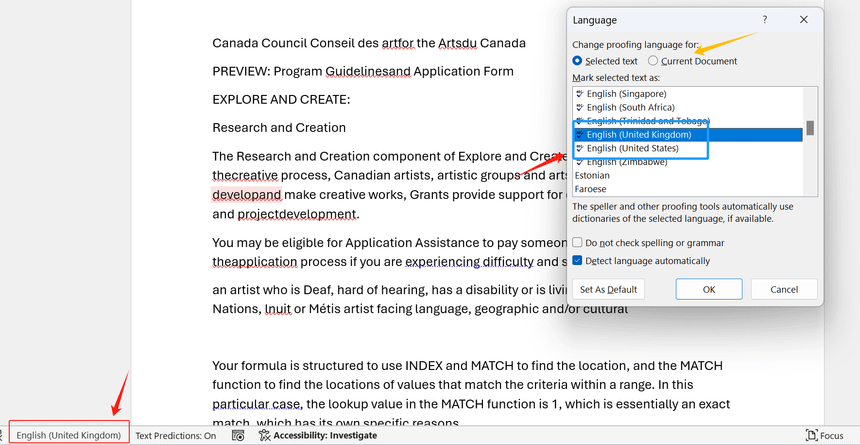 Open Word>Click the **** red box in the lower left corner as shown in the picture>Select Current Document in the pop-up Language window>Switch to English (United Kingdom)/English (United States) blue box **** >OK>Restart Word and Using the Read Aloud Function
