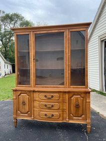 DESCRIPTION · Mid century modern tall curio cabinet with glass sides and wooden/glass shelves. Some light scuffing/scratching from age appropriate wear. The doors open and close with ease. · ***local pickup only please