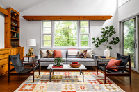October 9, 2024 - I think that a fun MCM rug in a bold pattern that includes both the color of the chair and the color of the sofa could really pull this room together. Maybe something like this: https://englishelm.com/collections/rugs/products/baxton-studio-kavir-mid-century-modern-hand-tufted-wool-area-rug