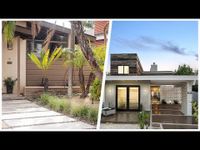 This gorgeous Mid-Century Modern makeover included a second story addition, exterior and full gut renovation. Plenty of large glass windows provide natural light into the home and an eye-catching blue front door provides some intrigue to the fron t entry.
