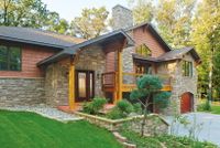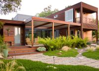 January 3, 2025 - This home combines a desert landscape with grass, splitting the house into two aesthetics and exemplifying the mixing of different landscape materials. Photo by Bret Gum. Stone balls accent the front lawn, bringing smooth texture to the busy brick exterior. The newly anodized aluminum Avanti garage door is teal, working with the lime-colored door to being vibrant hues into the yard. Photo by Jim Brown. This tract home depicts a low-slung roof—one of the more popular roof designs for Mid Century Modern style and curb appeal.