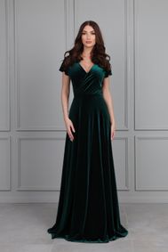 Maybe one of these? https://www.lulus.com/products/reinette-dark-green-midi-dress/715992.html https://www.lulus.com/products/outstanding-elegance-teal-green-satin-surplice-maxi-dress/1618816.html https://www.lulus.com/products/sweetest-admirer-emerald-green-ruched-surplice-maxi-dress/1703496.html