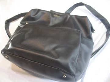 Mina Baie bundle diaper bag in nylon, napa leather, and neoprene Flat top handle Removable shoulder strap Two-way zip top closure Exterior, three slip pockets Interior, five slip pockets and one zipper pocket Includes changing mat and removable handles Overall, approx. 15.5"W x 7"D x 12.5"T Item Weight (Lbs.): 1.5 Trim: Leather Imported