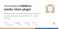 GitHub - monosans/mkdocs-minify-html-plugin: MkDocs plugin for minification using minify-html, an extremely fast and smart HTML + JS + CSS minifier. · GitHub