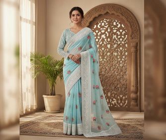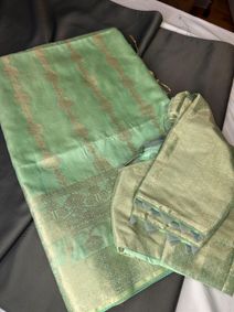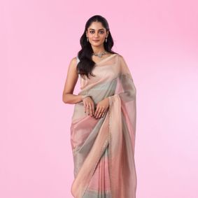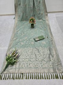 Saree Description:An ethereal and refined ensemble, this pastel green saree is made from an extremely soft, lightweight fabric that drapes effortlessly and feels luxurious to wear. The body is elegantly adorned with scattered silver floral sequin buttis, adding just a touch of shimmer without overwhelming the look. The saree is finished with a unique hand-twisted dual-tone border in peacock green and mint, offering a subtle yet artistic contrast.