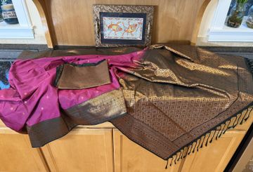 Charita mint green threadwork kanchipuram silk saree is a hands down winner if you wangt to try new pastel shades. A subtle mint green and lavendar combination, with lavendar thread woven checks and a selvedge. The pallu and blouse piece are lavendar . The pallu has simple zari lines as well.