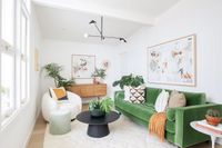 August 26, 2024 - If I had to describe the style of this room I’d call it retro botanical. I wanted to celebrate the home’s 1960s roots by embracing items with a mid-century feel - like the pedant light, sofa, side table and sideboard. The starting point for this room was that amazing ‘Quill’ pendant light from Beacon Lighting (it’s currently on sale too). It has a mid-century modern aesthetic and its black colouring really pops against the white walls and ceiling.