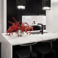 February 15, 2023 - The black hardware provides a sleek and modern touch, complementing the gray and white color scheme. The white island with a gray stone worktop and black stools is a functional and stylish addition, providing extra workspace and seating even though it is very small. Small kitchen spaces might ...
