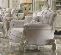 Model Leonie. Classic styled living room furniture upholstered in Ivory color velvet fabric. The Leonie sofa set with bone white finish will create an elegant, warm and traditional taste in living room. This sofa set reflects highly decorative base with scrolled feet, and fabric upholstery with deep button tufted backs and nail head trim accents add classic character representing luxurious details.