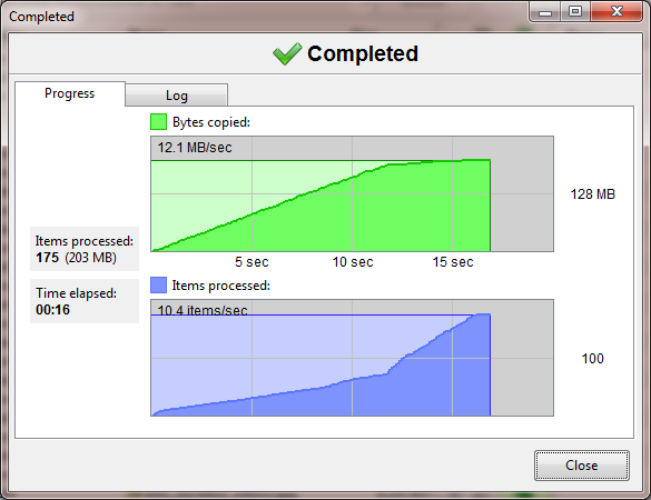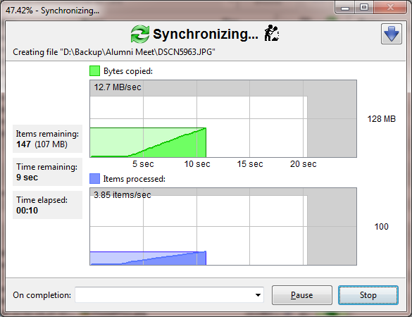 In the Menu bar, go to Actions → Start synchronization -- this will (as obvious) synchronize the two folders based on the setting you chose in Step 7. An e.g. of process, and completion would look like: