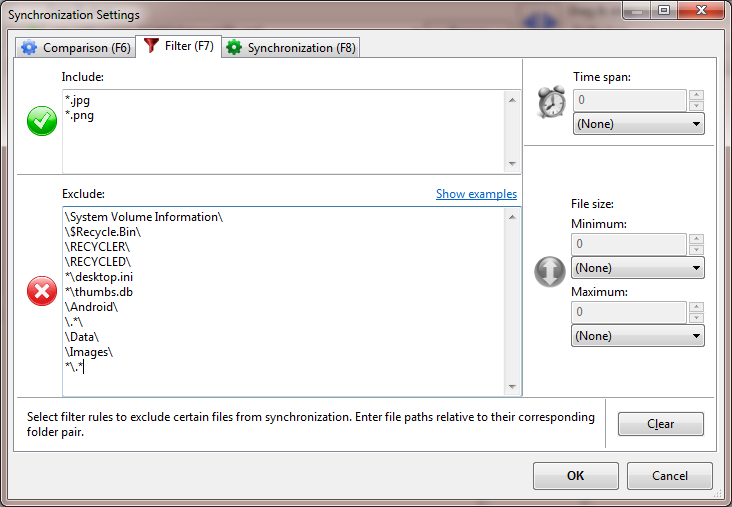 Androidfolder. Click OK when done with custom filters. (Note that I've not added but you may add video extensions too like.mp4,.mkv, etc.)In the Menu bar, go to Actions → Synchronization settings and choose any of the variant available. For the first backup I prefer Mirror to backup all the filtered files. Click OK at last.