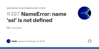 February 14, 2018 - Trace: Traceback (most recent call last): File "/Users/admin/websocket-client/websocket/_app.py", line 234, in run_forever dispatcher = self.create_dispatcher(ping_timeout) File "/Users/admin/websocket-client/websocket/_app.py", line 286, in create_dispatcher if self.sock.is_ssl(): File "/Users/admin/websocket-client/websocket/_core.py", line 180, in is_ssl return isinstance(self.sock, ssl.SSLSocket) NameError: name 'ssl' is not defined ·