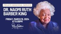 March 15, 2024 - Obituary for Dr. Naomi Ruth (Barber) King | A Private Memorial Service for Dr. Naomi Ruth Barber King will be held on Friday, March 15, 2024 at 6:00pm. This service will be live streamed for the public. A Celebration of Life Service will ...