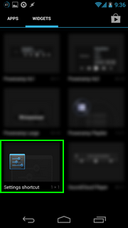 - Go to your app drawer, then tap the Widgets tab. Scroll until you reach Settings shortcut (1x1) widget.