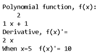 July 23, 2025 - Below are some examples where we compute the derivative of some expressions using NumPy. Here we are taking the expression in variable 'var' and differentiating it with respect to 'x'. ... import numpy as np # defining polynomial function var = np.poly1d([1, 0, 1]) print("Polynomial function, f(x):\n", var) # calculating the derivative derivative = var.deriv() print("Derivative, f(x)'=", derivative) # calculates the derivative of after # given value of x print("When x=5 f(x)'=", derivative(5))