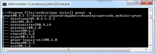 Below is an example screenshot for installing grunt from cmd.exe: