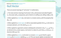 September 5, 2019 - There are several meanings of "null vector" in mathematics. 1. The most common meaning of null vector is the n-dimensional vector 0 of length 0. i.e., the vector with n components, each of which is 0 (Jeffreys and Jeffreys 1988, p. 64). 2. When applied to a matrix A, a null vector is a nonzero vector x with the property that Ax=0. 3. When applied to a vector space X with an associated quadratic form q, a null vector is a nonzero element x of X for which q(x)=0. 4. When applied...