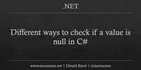 Let's inject some pragmatism here, however. So far we've talked about the potential for different modalities of comparison to yield different results. While this is certainly the case, there are certain types where it's safe to write a == null. Built-in .NET classes like String and Nullable<T> have well defined semantics for comparison. Furthermore, they are sealed - preventing any change to their behavior through inheritance. The following is quite common (and correct):
