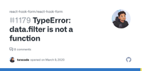 March 9, 2020 - TypeError: data.filter is not a function#1179 · Copy link · Labels · questionFurther information is requestedFurther information is requested · txrxcode · opened · on Mar 9, 2020 · Issue body actions · Describe the bug Getting folllowing error message on removal of item in fieldarray ·