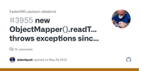 Describe the bug My software works since years, I updated to databind v2.15.1 and it started throwing exceptions. Version information 2.15.1 To Reproduce ObjectMapper mapper = new ObjectMapper(); J... More on github.com