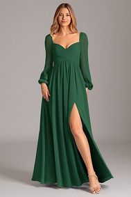 Dark green bridesmaid dresses are going strong this year! We adore the Azazie CA dark green long bridesmaid dresses, with draped bodice and sweetheart neckline.