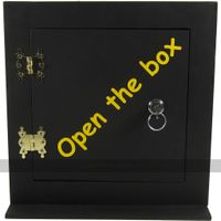 Open the Box Game - Manufactured in Solid wood with a wooden door, hinged with brass butterfly hinges. The whole unit is finished in matt black to give the finished product a sleek finish with gold lettering applied to the front. Great to drive sales and reward customer loyalty or use this at your fundraising event or local fete. Open the Box is a traditional game, frequently purchased as an entertainment game to generate sales. A simple and easy game, with a specialised design that contains 11 keys where only one key opens the lock to the box. Customers buy a key and if it opens the door they