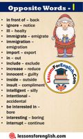 December 26, 2019 - English Detailed Opposite Antonym Words List, Opposite Words Starting With I in front of – back ignore– notice ill– healty immigrate– emigrate immigration– emigration import– export in– out include– exclude increase– reduce innocent– guilty inside– outside insult– compliment intelligent– silly intentional– accidental beinterestedin – bore interesting– boring interrupt– continue