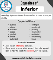 May 26, 2023 - Opposite of Inferior, Antonym of Inferior, 21 Opposite Words For Inferior Meaning; A person lower than another in rank, status, or ability Opposites of Inferior qualified eligible sufficient classic glorified choice authorized contingent conditioned provisory documented certificated documentary limited authoritative executive skilled enough adequate ample satisfactory Example Sentences Alex has an inferiority complex.