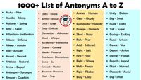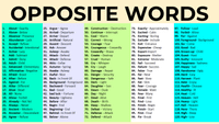 March 30, 2024 - In this blog post, we present an extensive A to Z list of over 2000 opposite words, providing you with a valuable resource to further enrich your language proficiency. Antonyms are the opposite words, they are different in meaning. Antonyms are the opposite words and are the opposite of synonyms. Antonyms are a very useful vocabulary lesson for beginner English ...
