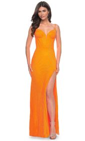 Those who prefer clean structure look toward silhouettes similar to Column Prom Dresses, letting orange stretch in a long, uninterrupted line that feels modern and refined.