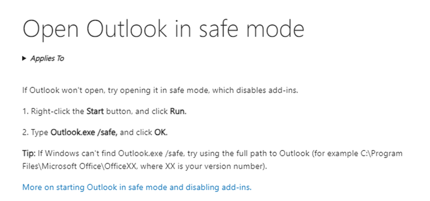 When you run Outlook in safe mode, it bypasses functionality and settings such as alternative startup location, changed toolbars, startup folders used by Outlook, Outlook add-ins, and most COM add-ins. While add-ins can enhance your experience, they can occasionally interfere, or conflict with Outlook.
