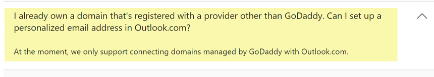 A: At the moment, we only support connecting domains managed by GoDaddy with Outlook.com.