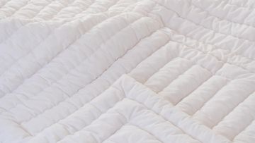 I have a giant king pure linen duvet cover that I place a silk stuffed comforter in. It's like covering up with butterfly wings of warmth. In summer we put a thin cotton quilt in the duvet cover. Hangs to the bottom of the highest mattress.