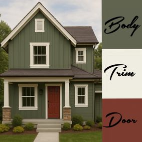 White siding, blue door, Grey trim. Railing stays as is. Also rip up that green crap and go exposed concrete or paint to match foundation
