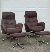 In great condition! Authentic, contemporary, European-inspired design chair with ottoman set by Palliser (tag on the bottom of the chairs). The frame is constructed with cold-cured foam encasing a steel frame.