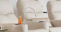 The Ovation home theatre collection looks just as comfortable as it feels. Each seat features a power headrest and power recline allowing for infinite adjustment and ensuring optimal comfort. The Ovation is designed with a higher back for added comfort and support, full chaise styling and a foam arm that includes storage. · This design is all about plush comfort, with the back and seat structured for full support and relaxation, just sink in and enjoy. The multi-color LED cupholder comes with a selection of seven colours, three intensity levels and ground lighting. Control the independent oper