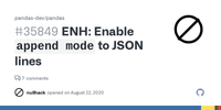 Answer from kmsquire on Stack OverflowIn versions of Pandas > 0.19.0, DataFrame.to_json has a parameter, lines, that will write out JSONL format.