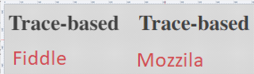 So it would appear the full viewer is using coloured subpixels (hardware aspect ?) for Anti-Alias, whereas the Fiddle is using simpler grey tones.