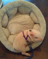 December 7, 2015 - Oscar loves hiding his snout in his new bed. I kept my eye out for the perfect mini pig bed for several weeks and finally picked one that he loves. It’s really soft and easy for him to get into, and it has a crevice where the sides of the bed meet the middle area that he can dig his snout into.