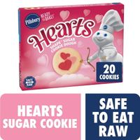 Make any day a sweet celebration with Pillsbury Ready to Bake! Hearts Shape Sugar Cookie Dough. This Pillsbury cookie dough is decorated with hearts and ready to pop in the oven. Each package comes with 20 pre-cut sugar cookies, perfect for Valentine's Day or just because. You can even eat the edible cookie dough uncooked (look for our \"safe to eat raw\" seal!). Just follow the simple steps on the package to preheat the oven, place cookies on an ungreased cookie sheet, and bake. Then let the cookies cool and enjoy. It's cookie baking without the mixing or measuring! At Pillsbury, we strive to