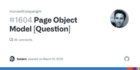 March 31, 2020 - microsoft / playwright Public · Notifications · You must be signed in to change notification settings · Fork 5.5k · Star 86.7k · New issueCopy link · New issueCopy link · Closed · Closed · Page Object Model [Question]#1604 · Copy link · tomern · opened · on Mar 31, 2020 ·