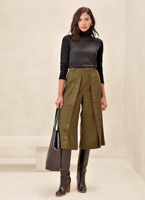 The trousers of this classic suit stay wide all the way to the bottom. Whether it's a wedding, specia... - Made to measure - Free Shipping The trousers of this classic suit stay wide all the way to the bottom. Whether it's a wedding, special occasion or even at any business-casual event, this sage green wide leg suit is a great option. Crafted by our artisans from Linen-cotton cloth, this slim-fit 2 button/s sage green blazer features a peak lapel. Linen-Cotton keeps the medium rise waistline smooth and the wide legs crisp on these retro-inspired everyday pants. · At sumissura every single s