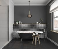 This colour is a perfect fit for the bathroom floor, bathroom wall, shower floor, shower wall, pool, fireplace surround, countertop, outdoor, and kitchen floor. These pressed, straight edge, matte, nontextured, non-glazed, with no natural variation, square, patterned look, singular, porcelain tiles ...